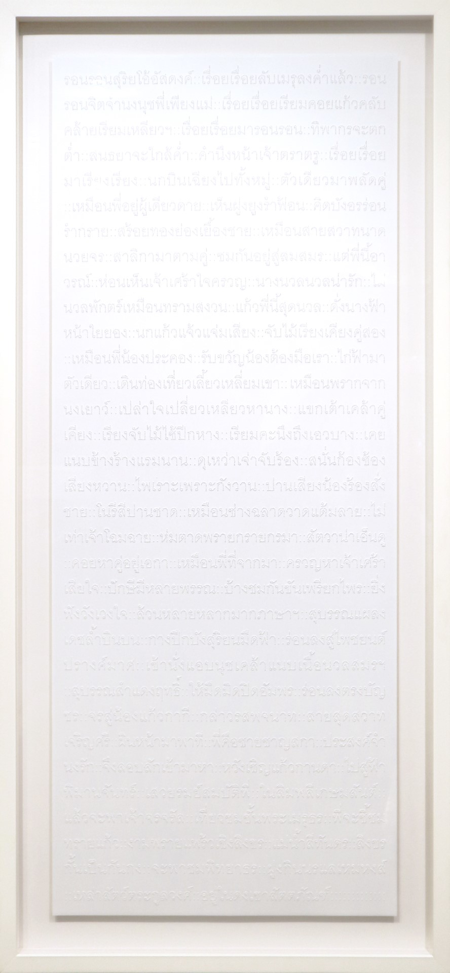 We wanted real fine art for each room,” he says. The other constraint? The designer had envisioned white paintings—on white walls. Disaphol thought of the artist Nipan, who is known for his textured conceptual work. The Royal Barge Procession is a beautiful epic hymn composed by a prince from the late-Ayutthaya period, sung by a chanter to direct the rhythmic strokes of the rowers. Nipan selected sections from the lyrics and used a needle to punch small holes to write them in Thai on white paper. Each room has its own unique edition handmade by the artist. “You really have to go close to see the words,” Disaphol says. “It’s super special.”