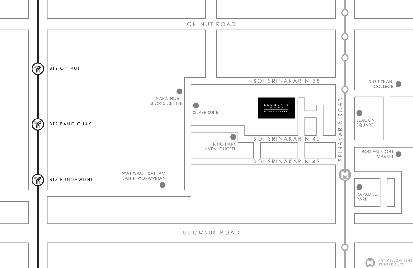 Elements Srinakarin has been conceptualised as a refreshingly uncompromising offering for middle-income buyers. The project is located within walking distance to three department stores, as well as a short distance away from major universities, hospitals, and Suvarnabhumi International new airport train line, which is essentially connected to two other mass transit routes.